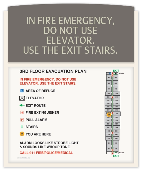 • Post directly above the elevator call button with the top of the sign 72" above floor to instruct people to use the stairs in the event of an emergency, not the elevator.